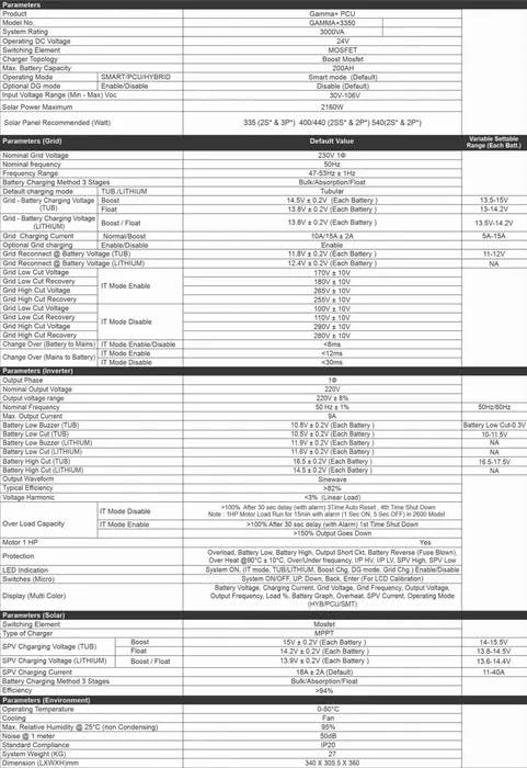 - 【SPECS HIGHLIGHTS】Battery Requirement: 2x 12V Tubular Lead Acid Battery or UTL Lithium Battery 25.6V; System Rating: 3000VA; Solar Charge Controller: MPPT; Voc: 30-106V; SPV Max: 2200-2300Watts; AC Voltage: 170-290V
