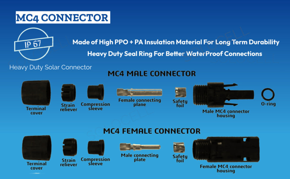 Our Connectors makes a rock solid connection once the pins are properly crimped with Solar DC Wire. Solocell MC4 connector are more durable compare to other similar products in the market. These connectors are design to withstand extreme weather conditions and heavy loads up to 1000 Volt - 30 AMP current.